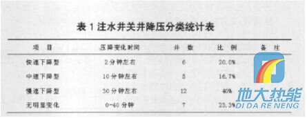 為確定合理降壓時(shí)間,在我隊(duì)30口注水井洗井過程中觀察注水井壓力隨關(guān)井時(shí)間的變化,以短時(shí)間(60分鐘)壓力出現(xiàn)直線段或相對直線段統(tǒng)計(jì),歸納總結(jié)如表1所示的幾種類型:快速下降型、中速下降型、慢速下降型、無明顯變化型。 根據(jù)調(diào)查統(tǒng)計(jì)結(jié)果,來確定不同類型的關(guān)井降壓時(shí)間:快速下降型的井只需關(guān)井3 ̄5分鐘;中速下降型的注水井需關(guān)井10 ̄15分鐘;慢速下降型的注水井需關(guān)井降壓30分鐘,無明顯變化型的注水井可直接洗井(洗井時(shí)應(yīng)觀察壓降的變化)。為此關(guān)井降壓的最佳時(shí)間應(yīng)該是壓降變化趨于穩(wěn)定的時(shí)間,較為合理。