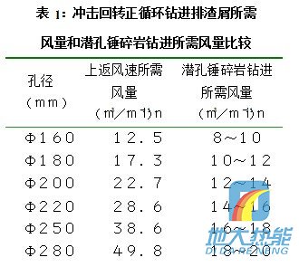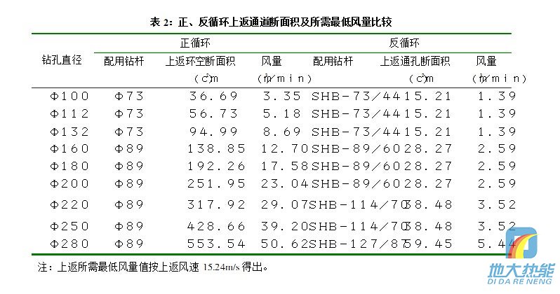 基巖水井通常口徑為Φ160~Φ280mm之間,該口徑硬巖的鉆進效率低,成本高,施工周期長,成為鉆探界亟待解決的難題。20世紀70年代開始,我國已引進潛孔錘技術(shù)應(yīng)用于水井鉆鑿,鉆進效率數(shù)倍提高,展示了潛孔錘鉆進的良好前景。但水井工程,孔深大,背壓高,配套使用的空壓機不但風量要求大,風太也高,使鉆進成本大幅度增高。主要矛盾是滿足排渣屑上返風速的要求時,供風量巨大,遠超過了潛孔錘本身工作的需求。計算不同孔徑條件下滿足上返風速15m/s供風量的需求,見表1(Φ89鉆桿為例)。表1數(shù)據(jù)表明,孔徑越大,為滿足排渣屑要求而消耗的能量越大,經(jīng)濟性越差。若實施反循環(huán)鉆井技術(shù)工藝,則排渣屑所需風量大大減小,如表2所示。