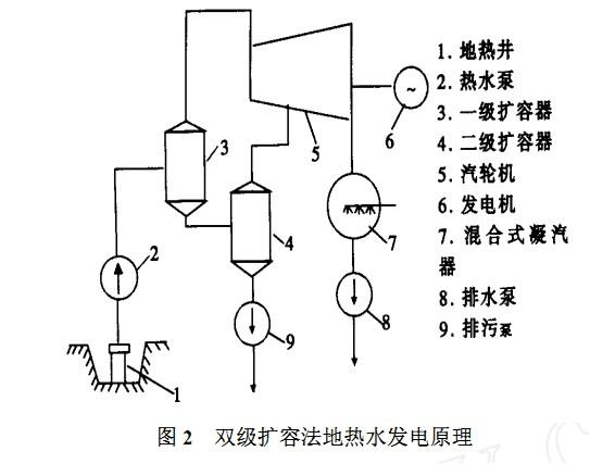 西南電力設計院設計的羊八井地熱電站第1臺試驗機組,容量為1000kW,汽輪機是利用四川內(nèi)江電廠2500kW廢棄設備改造而成。于1977年10月試運成功,采用單級擴容法熱力系統(tǒng)。若把地熱水送入1個密閉的容器中降壓、擴容,根據(jù)水沸點與壓力的關系,可使溫度不太高的地熱水因氣壓降低而沸騰變成蒸汽。由于地熱水降壓蒸發(fā)的速度很快,是一種閃急蒸發(fā)過程;同時,地熱水蒸發(fā)產(chǎn)生蒸汽時,其體積迅速擴大,所以該容器稱為“擴容器”或“閃蒸器”。用這種方法產(chǎn)生蒸汽來發(fā)電稱為擴容法地熱水發(fā)電。這是利用地熱田熱水發(fā)電的主要方式之一,該方式分單級擴容法系統(tǒng)和雙級(或多級)擴容法系統(tǒng)。擴容法系統(tǒng)的原理是:將地熱井來的中溫地熱汽、水混合物,先送到擴容器中進行降壓、擴容(稱閃蒸),使其產(chǎn)生部分蒸汽,蒸汽經(jīng)過分離器除去雜質(zhì)(10μm及以上)后,再引到常規(guī)汽輪機機發(fā)電。