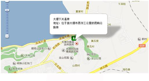 下關溫泉,位于距大理市(下關)西3公里的西洱河峽谷中,在昆畹公路即320國道旁,原名大理“德勝關”,又名塘子鋪,現附近的村子叫青菜莊。據《趙州志》記載:“德勝鋪,北通太和縣(今大理古城),有德勝關市。”由此可知原為大理西通保山的關隘要塞,后為集市,又因有大理溫泉而得名。大理下關溫泉泉水從石罅中涌出,大理下關溫泉流量每天為200噸,水溫為76℃,含有碳酸鹽等十多種礦物質,水質優良,浴后皮膚滑潤,對皮膚病、風濕病等有一定的療效。